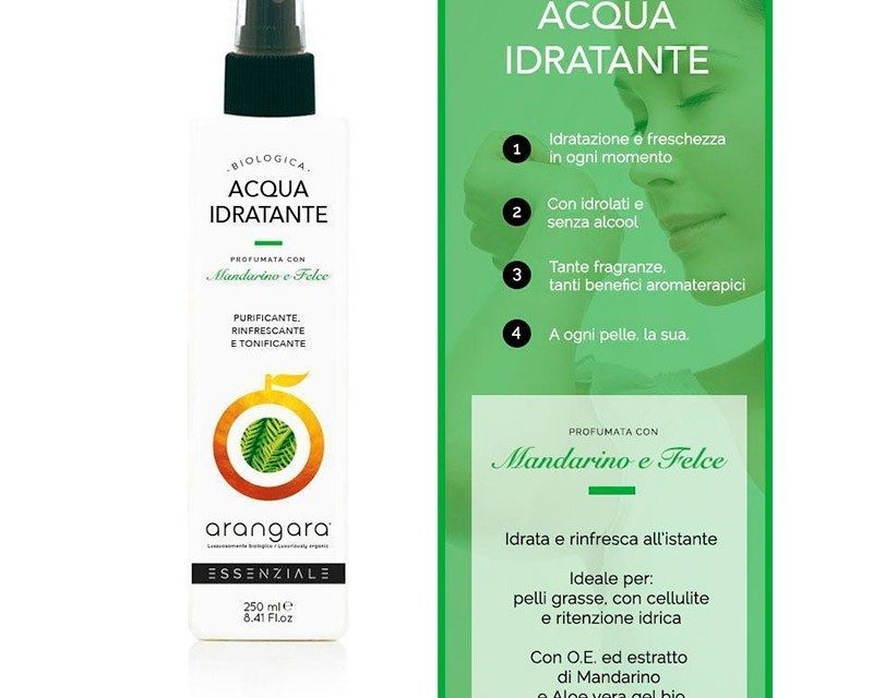 L’acqua idratante Arangara idrata la pelle ma al tempo stesso regala una sferzata energizzante al nostro corpo. E’ arricchita con oli essenziali ed estratti di mandarino di Calabria che ha proprietà purificanti e tonificanti, ed aloe vera che invece svolge una funzione idratante e lenitiva.