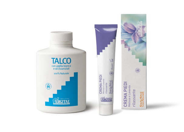 Per chi cammina molto, e per chi ha l’esigenza di contrastare la sudorazione, è possibile utilizzare in aggiunta il Talco Argital con Argilla bianca e puri oli essenziali di Menta, Timo e Limone: una polvere impalpabile di talco e Argilla bianca ad azione assorbente, rinfrescante, antimicotica, particolarmente adatta a chi fa sport e a chi desidera mantenere i piedi sempre freschi e asciutti.
