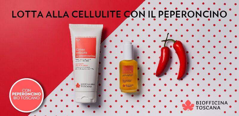 Biofficina Toscana ha presentato due novità con peperoncino bio toscano che arricchiscono la linea corpo: la Crema cellulite e l’Olio cellulite.