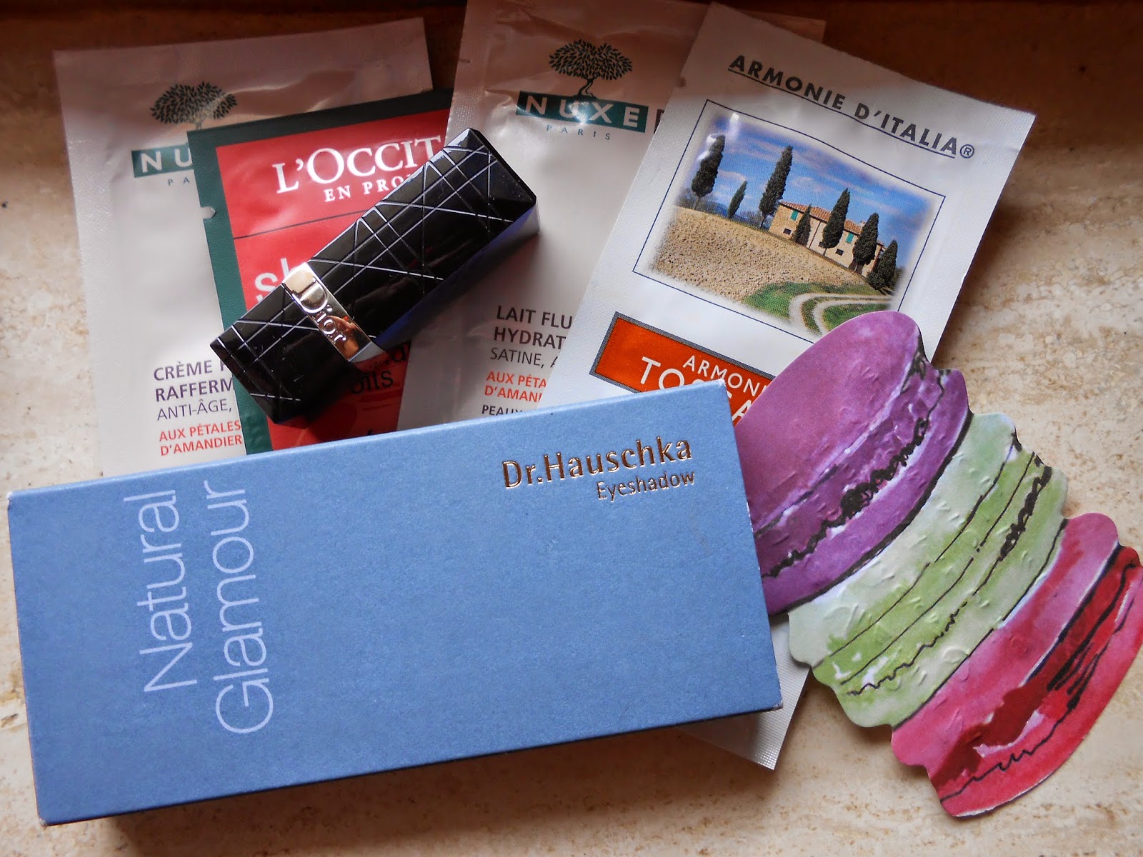 Anch’io vi ho partecipato e mi sono aggiudicata i prodotti che vedete in foto incluso un bigliettino tenerissimo con Macaroon disegnati e alcuni campioncini.