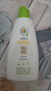 Detergente intimo delicato alla camomilla bio, deterge mantenendo inalterato il naturale pH fisiologico e donando una piacevole sensazione di freschezza. E’ adatto per un uso frequente perchè composto da più del 98% di acqua purificata e da ingredienti di derivazione vegetale; 0% siliconi, parabeni, petrolati, peg, acrilati.