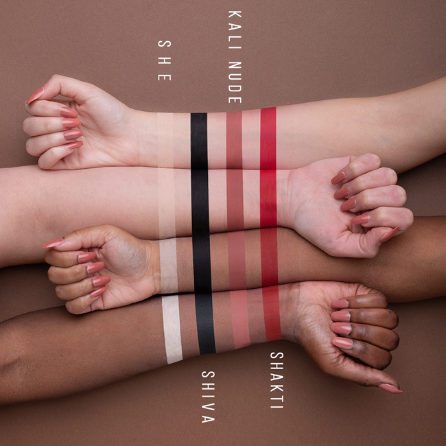All’interno di SHIVA troviamo: – una palette occhi : SHIVA palette – 4 rossetti in stick : SHER, NIPPLE, BOLLYWOOD, DUALITY – 2 matite occhi : SHIVA, SHE.