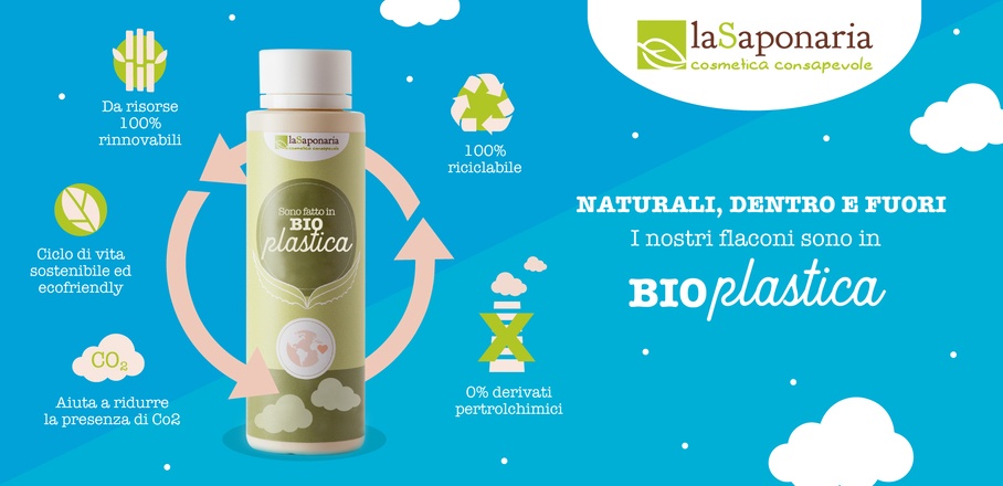Questo il logo utilizzato da La Saponaria per indicare che quel flacone è stato prodotto con bioplastica
