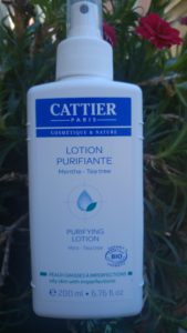 Generalmente amo utilizzare gli idrolati in purezza come l’acqua di rose, di rosmarino o di camomilla, però devo dire che mi piace anche provare nuovi prodotti e così ho acquistato la lozione purificante di Cattier in quanto adatta proprio ad una pelle grassa e con imperfezioni come la mia.