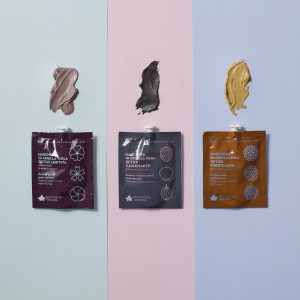 Le argille –viola, nera e oro -agiscono in sinergia con gli estratti mirati delle singole maschere, che si possono applicare su tutto il viso o combinate tra loro per un uso multimasking. Si applica cioè una maschera diversa in ogni parte del volto, per dare un prodotto che risponda alle esigenze delle differenti zone.