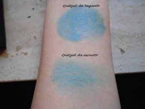 Di questa collezione mi ha colpito l’ombretto Quetzal perchè soprattutto d’estate, amo truccarmi con colori che tendono al verde e al turchese. E’ un bellissimo ombretto satinato, duochrome, color verde acqua che tende all’azzurro pervinca.