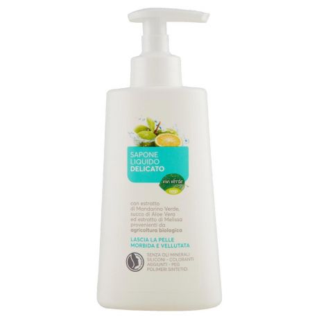 Sapone Liquido Delicato arricchito con estratto di Mandarino verde (Citrus nobilis Fruit Extract), succo di Aloe vera (Aloe barbadensis Leaf Juice) ed estratto di Melissa (Melissa officinalis Leaf Extract) provenienti da agricoltura biologica. Lascia la pelle morbida e vellutata.