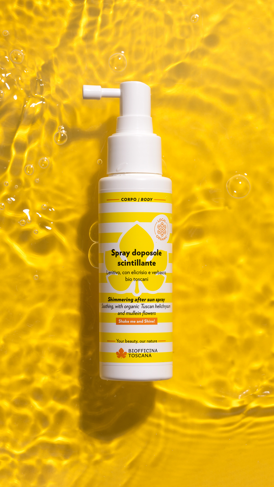Si tratta di uno spray doposole viso-corpo dalla texture leggera per una immediata sensazione di freschezza, idratazione e sollievo. Estratti bio toscani di elicriso e verbasco agiscono in sinergia con aloe ed un principio derivato dall’avena per un’azione lenitiva-idratante. Contiene inoltre miche dorate che enfatizzano e risaltano l’abbronzatura donando alla pelle un effetto luminoso. Lascia la pelle del viso e del corpo lenita, idratata, piacevolmente morbida e scintillante.