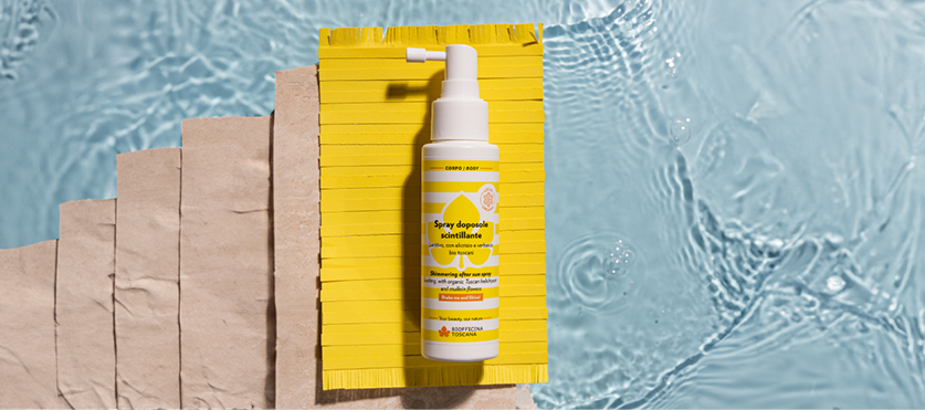 Lo Spray doposole scintillante, novità in casa Biofficina Toscana, dona alla pelle tutti i benefici di uno spray lenitivo-rinfrescante doposole insieme alla bellezza di un’abbronzatura intensificata e dorata.